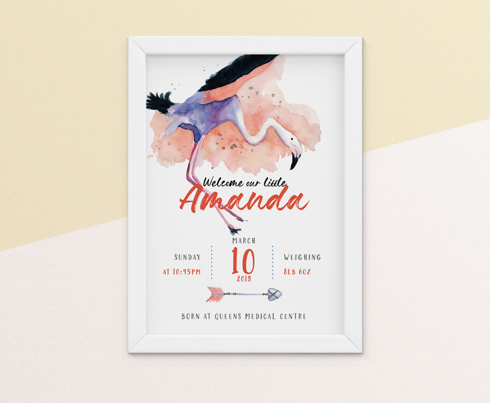 Another treat for you! You can actually personalize the flamingo prints that include names! Add your own details, name, date or letters and make it a special poster!
